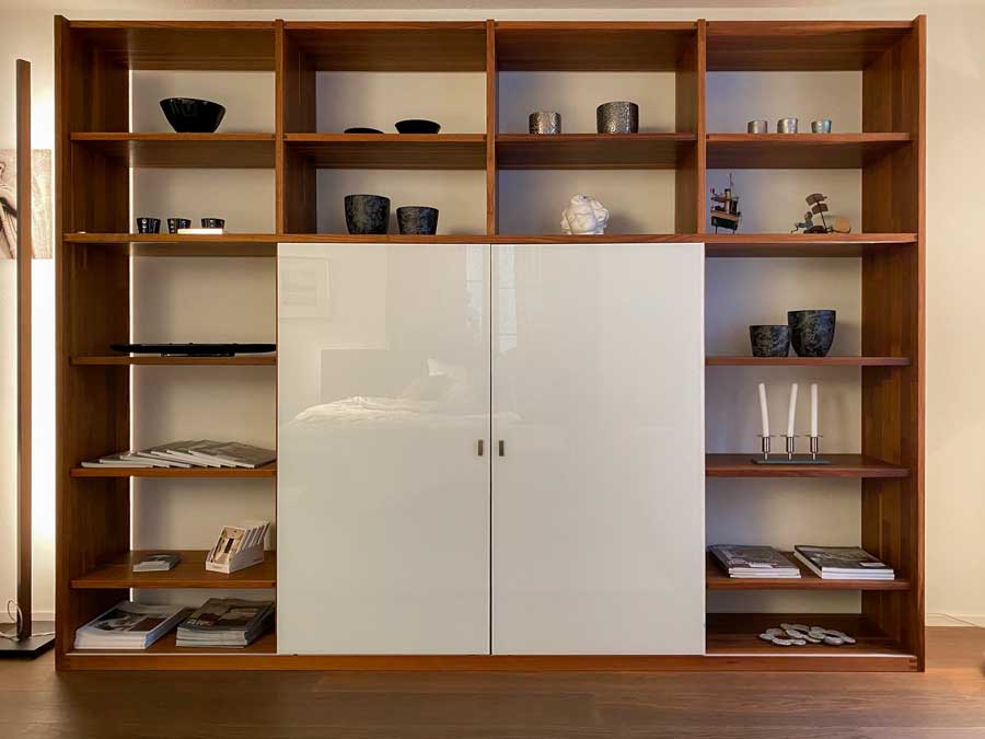 Regalwand Team 7 CUBUS, Nussbaum massiv mit Glasschiebetüren weiss, B 270 cm x H 204 cm x T 41 cm